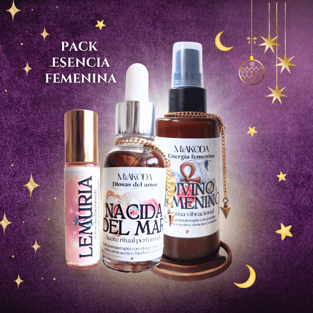 El Pack Esencia Femenina celebra la energía suavemente poderosa del agua, la intuición y el amor propio. Está compuesto por tres rituales aromáticos que trabajan distintas capas del femenino interno: la memoria ancestral, la conexión emocional y la sacralidad del cuerpo.